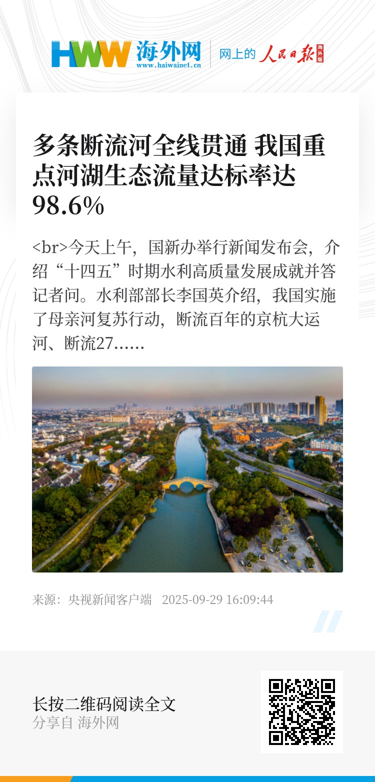 水利部部长李国英介绍,我国实施了母亲河复苏行动,断流百年的京杭大运河、断流27年的西辽河、断流26年的永定河等一批河流全线贯通,重点河湖生态流量达标率达98.6%,整治“乱占、乱采、乱堆、乱建”问题14万个,河湖面貌发生新变化。海河流域30条断流的河流恢复流动,京津冀治理区浅层地下水和深层地下水较“十三五”末分别回升3.29米和7.67米,102眼干涸的泉眼实现复涌。预计新增水土流失治理面积34万平方公里、水土保持率达73%。