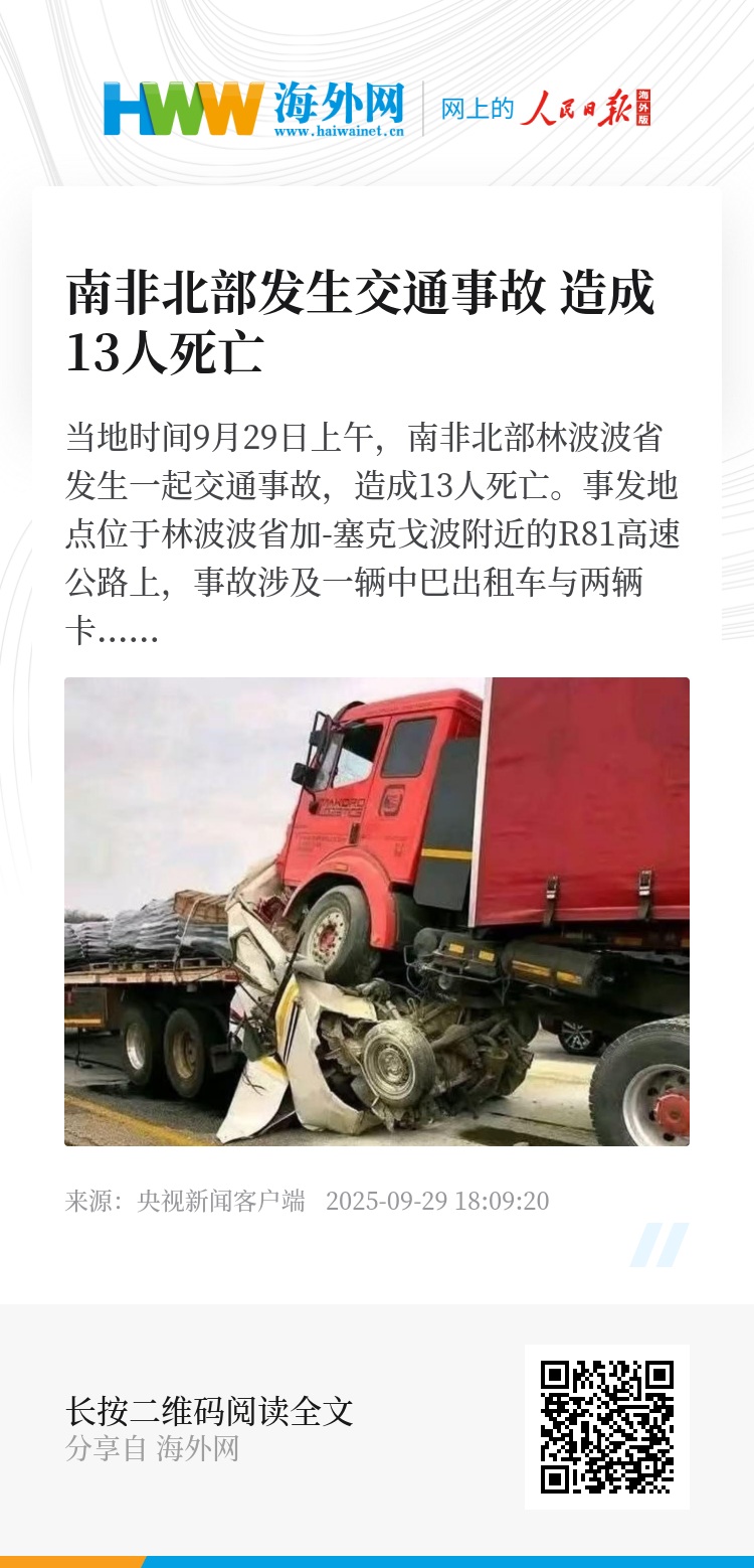 当地时间9月29日上午,南非北部林波波省发生一起交通事故,造成13人死亡。
