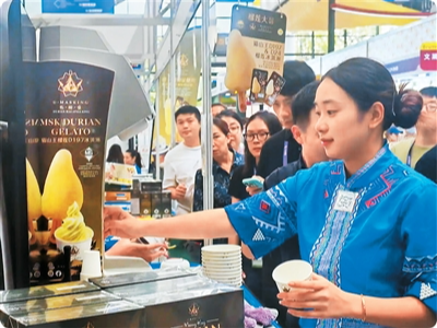 在东盟国家展区马来西亚馆,一款造型酷似榴莲果肉的冰激凌成了“明星展品”,人们在“榴莲大哥”品牌展位前排起长队。“第二次来东博会,展位大了一倍,人也多到忙不过来!”马来西亚“榴莲大哥”集团负责人吴联波正忙着招呼顾客。