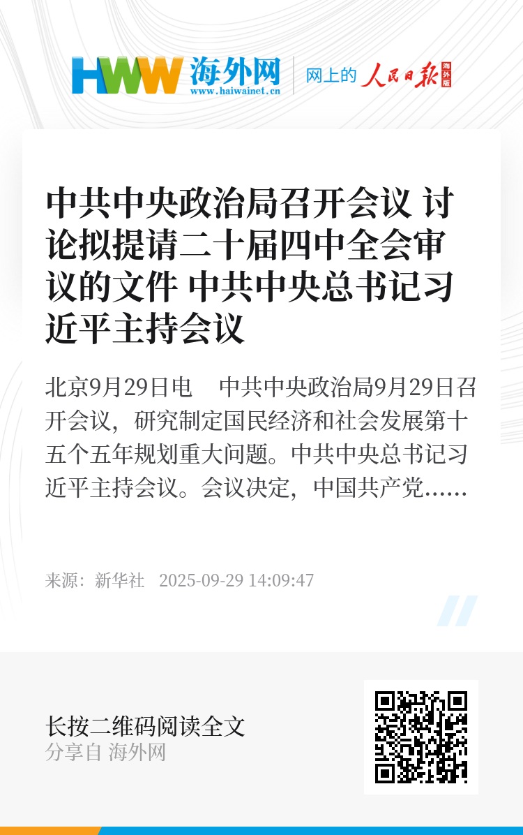 新华社北京9月29日电 中共中央政治局9月29日召开会议,研究制定国民经济和社会发展第十五个五年规划重大问题。中共中央总书记习近平主持会议。