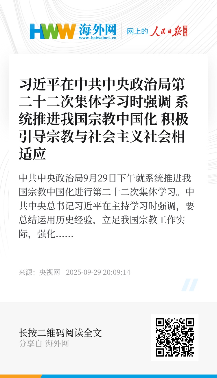 中共中央政治局9月29日下午就系统推进我国宗教中国化进行第二十二次集体学习。中共中央总书记习近平在主持学习时强调,要总结运用历史经验,立足我国宗教工作实际,强化系统观念,加强体制规范建设,加强综合治理,加强基层基础工作,系统推进我国宗教中国化,积极引导宗教与社会主义社会相适应。