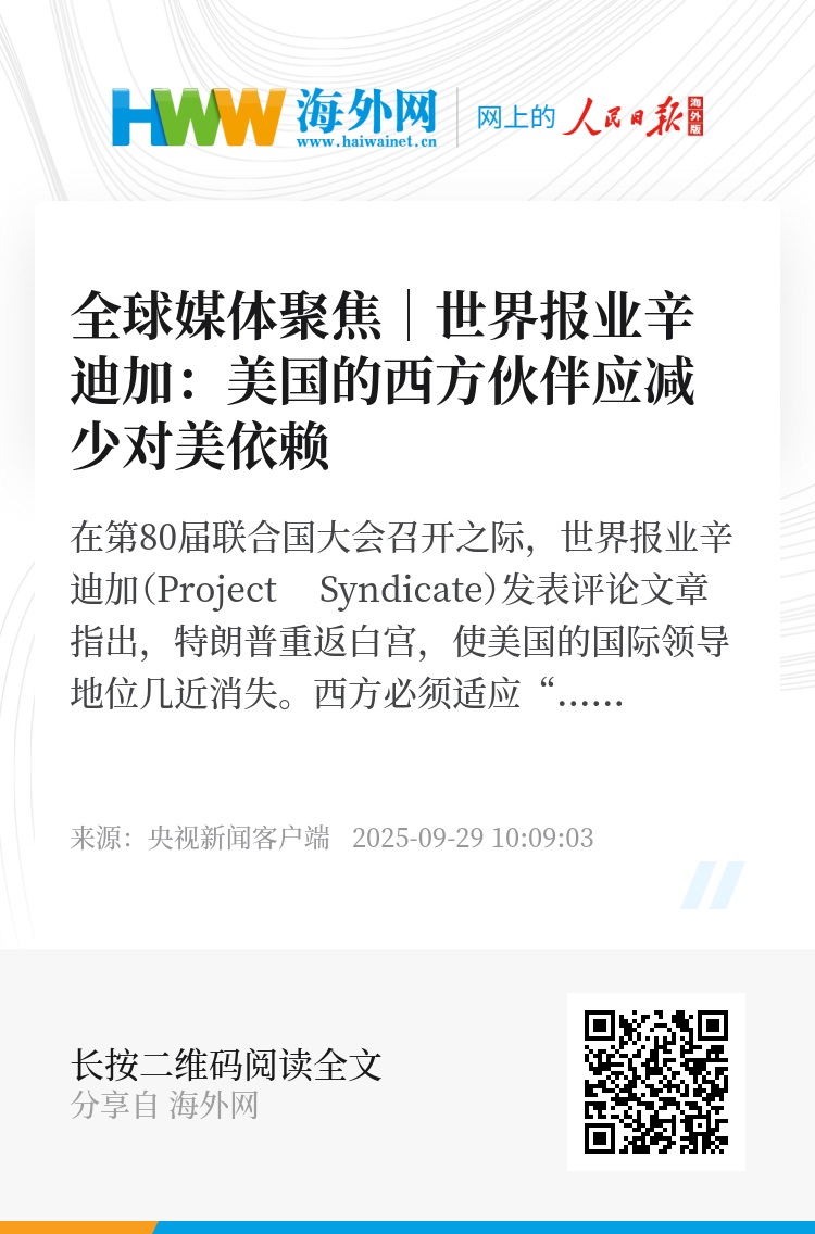 在第80届联合国大会召开之际,世界报业辛迪加(Project Syndicate)发表评论文章指出,特朗普重返白宫,使美国的国际领导地位几近消失。西方必须适应“没有美国领导”的现实局面。