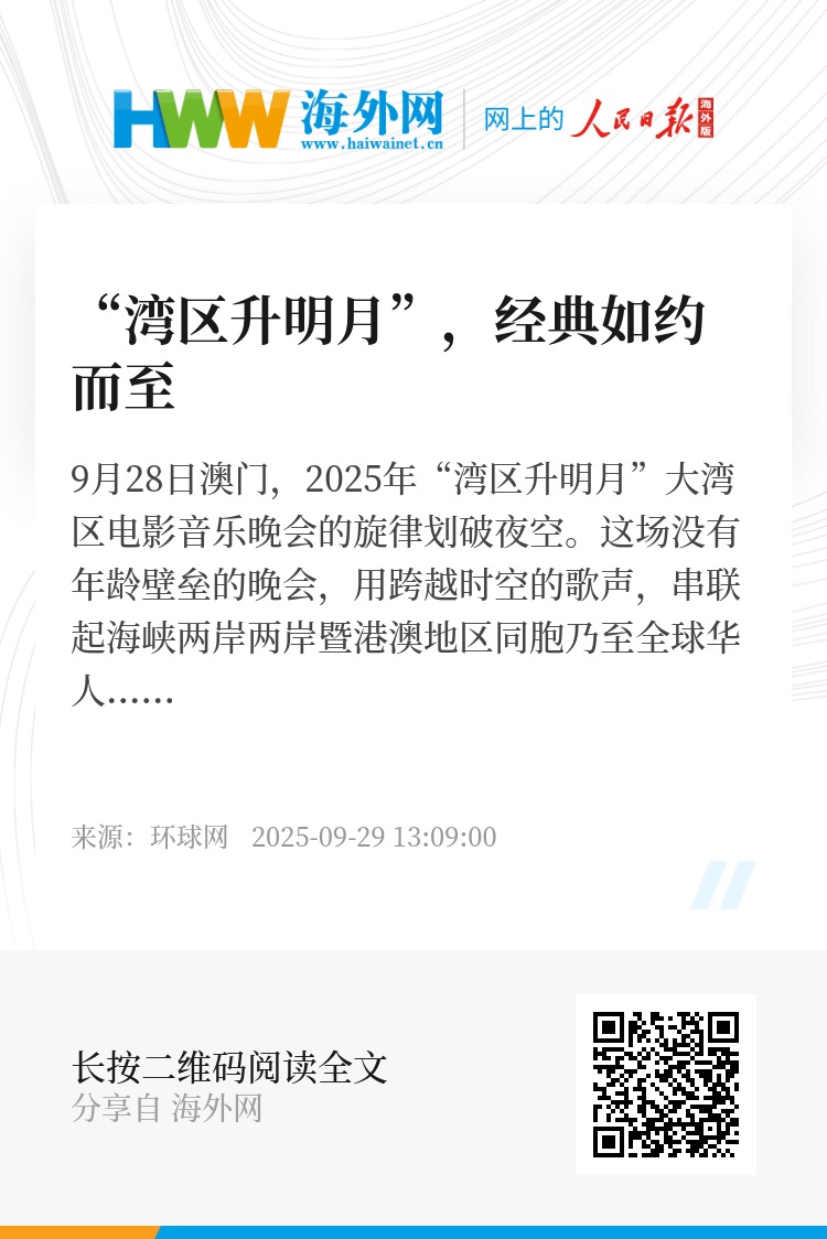 9月28日澳门,2025年“湾区升明月”大湾区电影音乐晚会的旋律划破夜空。这场没有年龄壁垒的晚会,用跨越时空的歌声,串联起海峡两岸两岸暨港澳地区同胞乃至全球华人的共同记忆,凝聚了深切浓烈的民族感情。