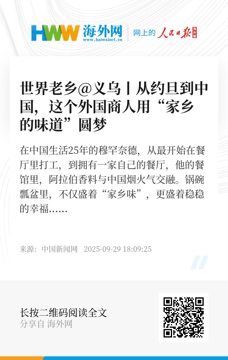 在中国生活25年的穆罕奈德,从最开始在餐厅里打工,到拥有一家自己的餐厅,他的餐馆里,阿拉伯香料与中国烟火气交融。锅碗瓢盆里,不仅盛着“家乡味”,更盛着稳稳的幸福。就像他说的,“来到义乌会让你实现梦想”。