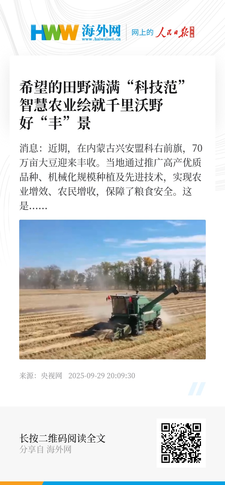 央视网消息:近期,在内蒙古兴安盟科右前旗,70万亩大豆迎来丰收。当地通过推广高产优质品种、机械化规模种植及先进技术,实现农业增效、农民增收,保障了粮食安全。