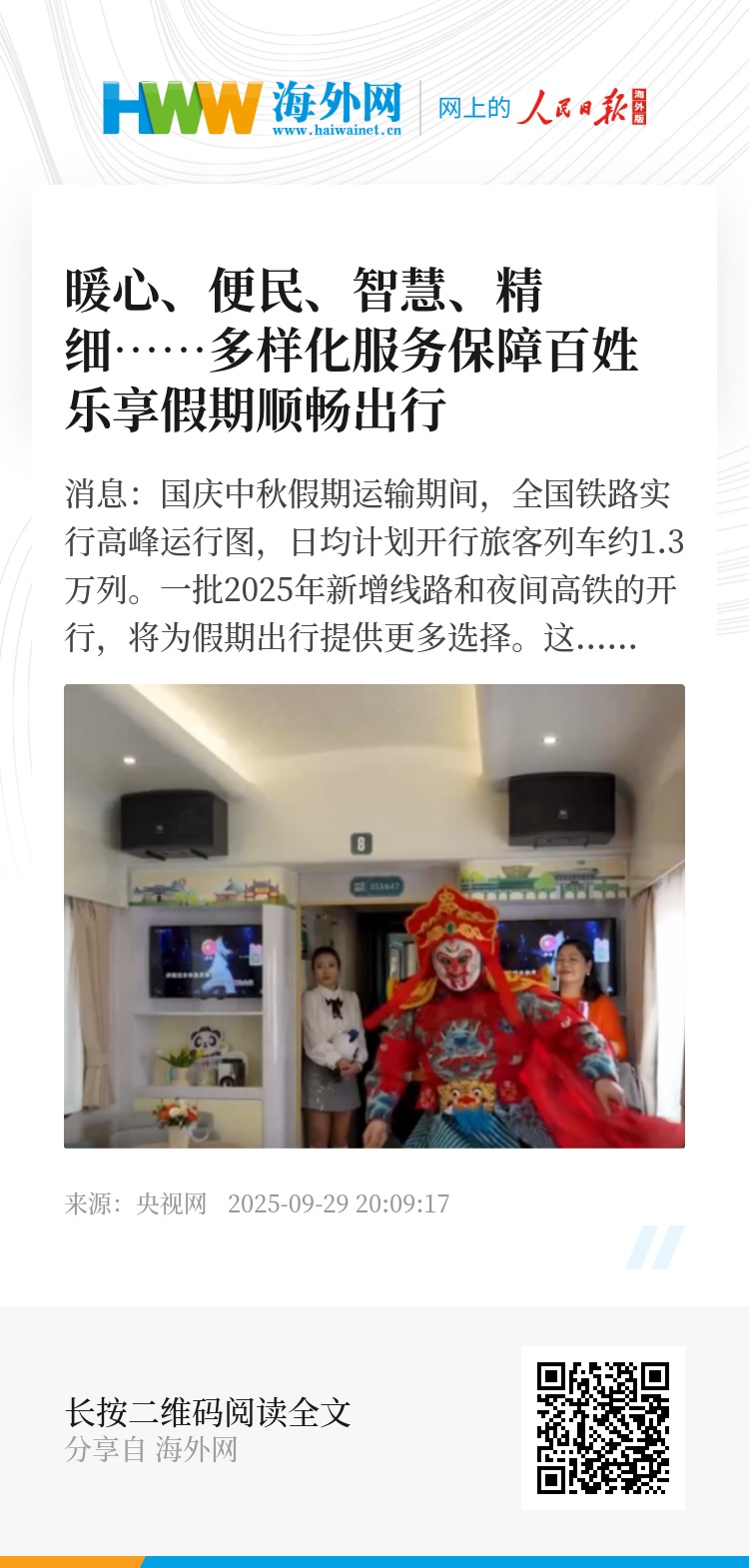 央视网消息:国庆中秋假期运输期间,全国铁路实行高峰运行图,日均计划开行旅客列车约1.3万列。一批2025年新增线路和夜间高铁的开行,将为假期出行提供更多选择。