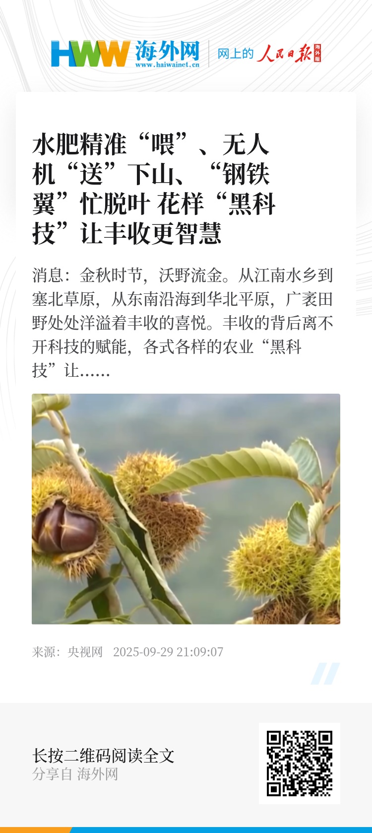 央视网消息:金秋时节,沃野流金。从江南水乡到塞北草原,从东南沿海到华北平原,广袤田野处处洋溢着丰收的喜悦。丰收的背后离不开科技的赋能,各式各样的农业“黑科技”让秋收更添智慧。