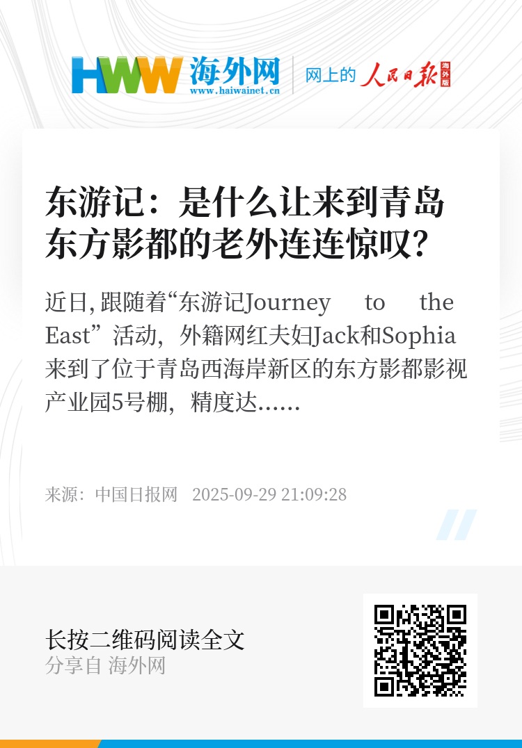近日,跟随着“东游记Journey to the East”活动,外籍网红夫妇Jack和Sophia来到了位于青岛西海岸新区的东方影都影视产业园5号棚,精度达亚毫米级别的动作捕捉技术和实时渲染让他们看着屏幕中和自己同步的动画形象连连感叹:Amazing!(黎霈融)