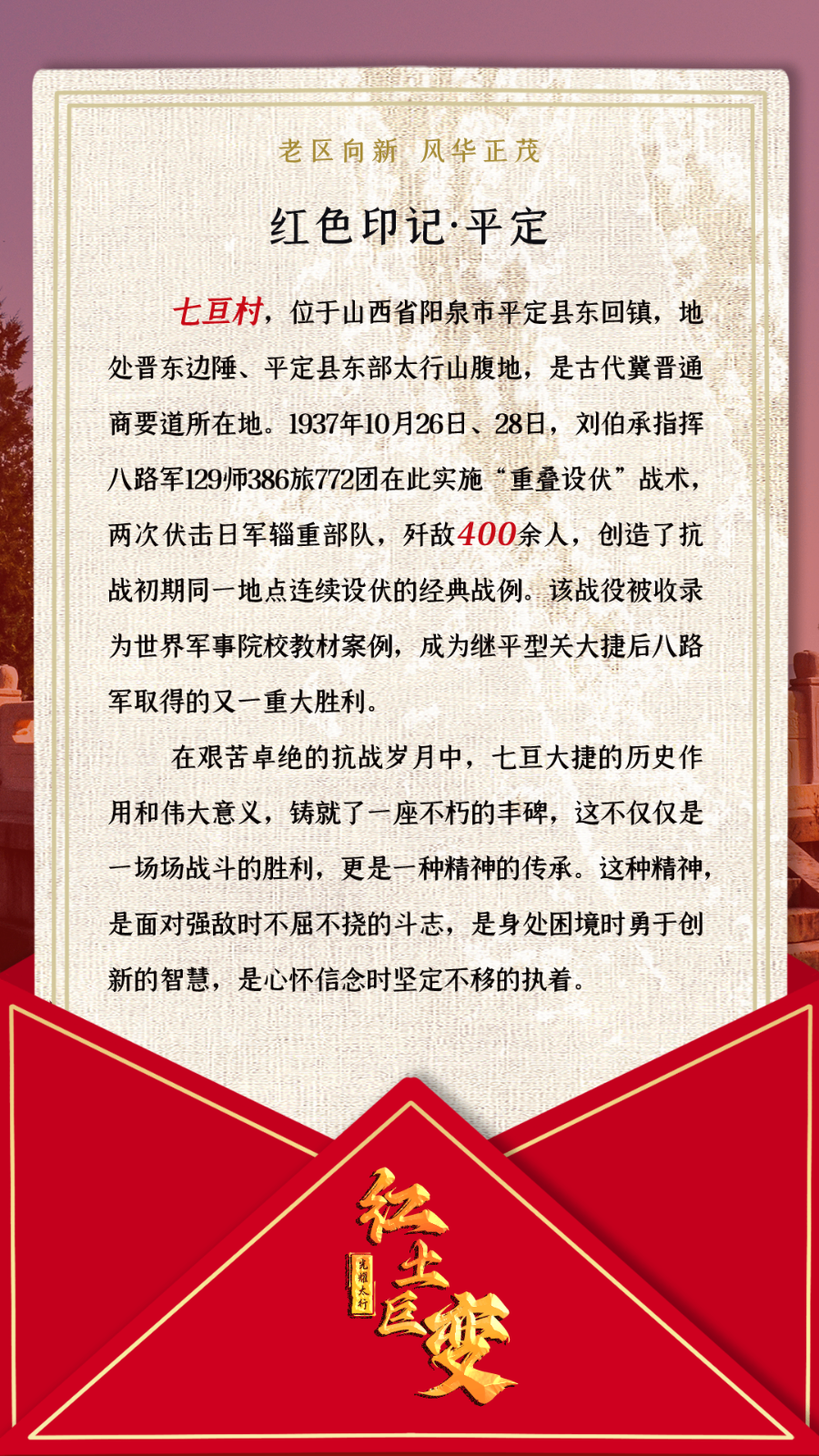 1937年,刘伯承指挥八路军在阳泉市平定县七亘村连续两次伏击日军,以教科书式的“重叠设伏”战斗方式,取得了八路军挺进太行山的首战胜利。七亘村这个名字,也因这场战斗载入了军事史册。