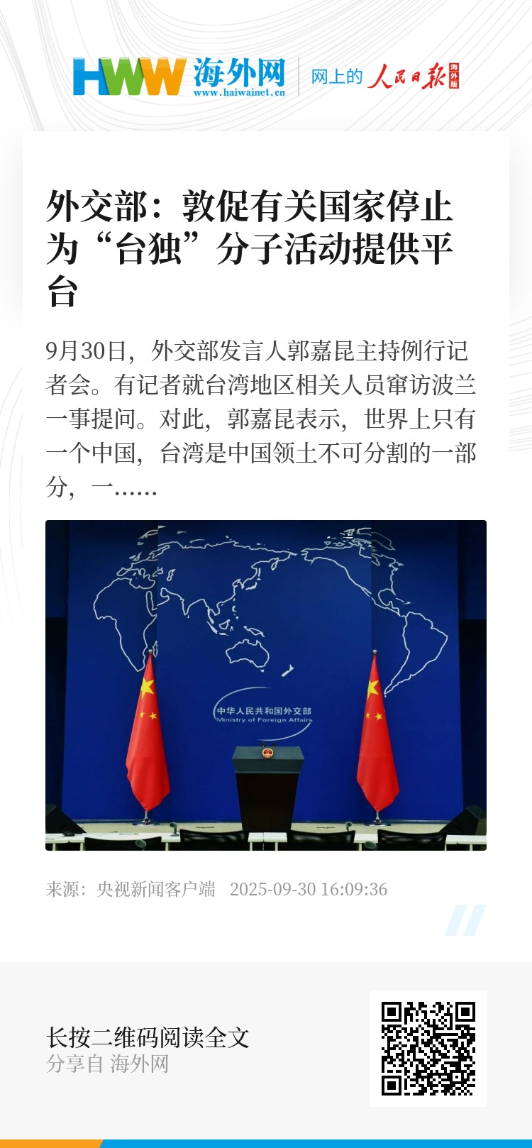 9月30日,外交部发言人郭嘉昆主持例行记者会。有记者就台湾地区相关人员窜访波兰一事提问。对此,郭嘉昆表示,世界上只有一个中国,台湾是中国领土不可分割的一部分,一个中国原则是中国和建交国建立和发展外交关系的政治基础,也是国际关系的基本准则和国际社会的广泛共识。
