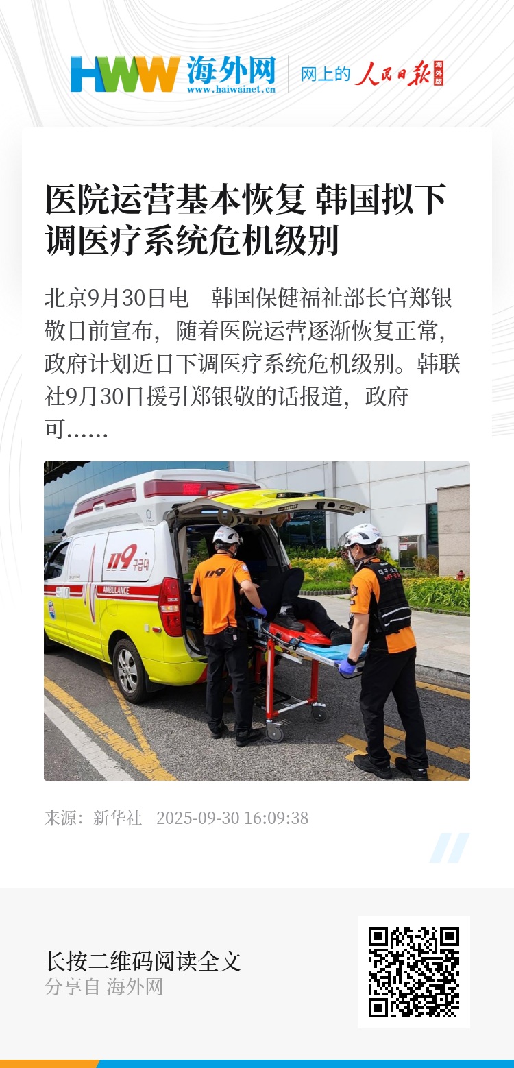 新华社北京9月30日电 韩国保健福祉部长官郑银敬日前宣布,随着医院运营逐渐恢复正常,政府计划近日下调医疗系统危机级别。