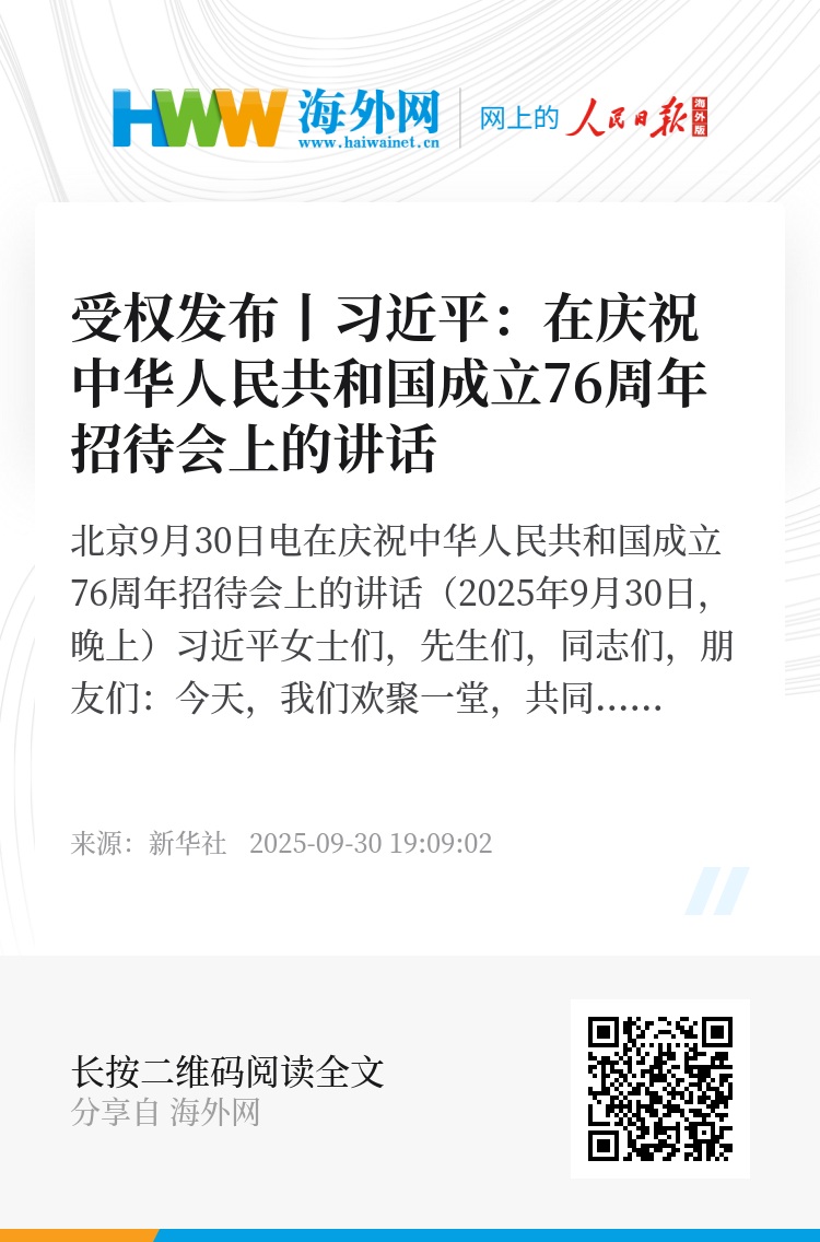 今天,我们欢聚一堂,共同庆祝中华人民共和国成立76周年。首先,我代表党中央和国务院,向全国各族人民,向中国人民解放军指战员和武警部队官兵,向各民主党派和无党派人士,致以节日祝贺!向香港特别行政区同胞、澳门特别行政区同胞、台湾同胞和海外侨胞,致以诚挚问候!向长期以来关心和支持中国建设事业的友好国家和国际友人,致以衷心感谢!