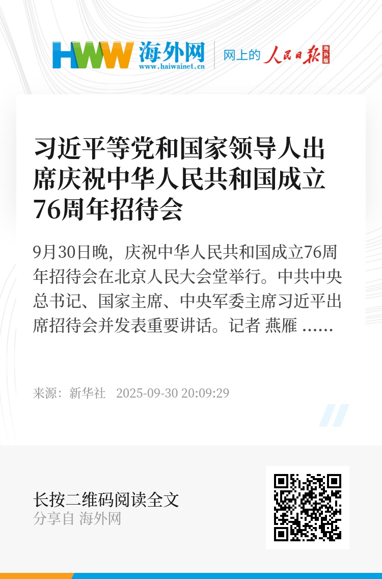 9月30日晚,庆祝中华人民共和国成立76周年招待会在北京人民大会堂举行。习近平、李强、赵乐际、王沪宁、蔡奇、丁薛祥、李希、韩正等党和国家领导人与中外人士欢聚一堂,共庆中华人民共和国华诞。