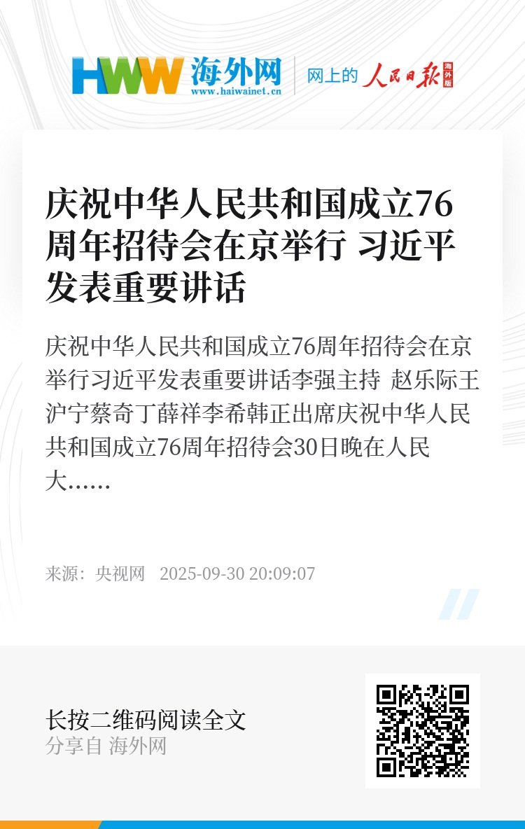 庆祝中华人民共和国成立76周年招待会30日晚在人民大会堂举行。中共中央总书记、国家主席、中央军委主席习近平出席招待会并发表重要讲话。他强调,实现中华民族伟大复兴是前无古人的伟大事业。憧憬和挑战,都激发我们只争朝夕、永不懈怠的奋斗精神。我们要更加紧密地团结在党中央周围,锐意进取、埋头苦干,奋力谱写中国式现代化更加绚丽的篇章。