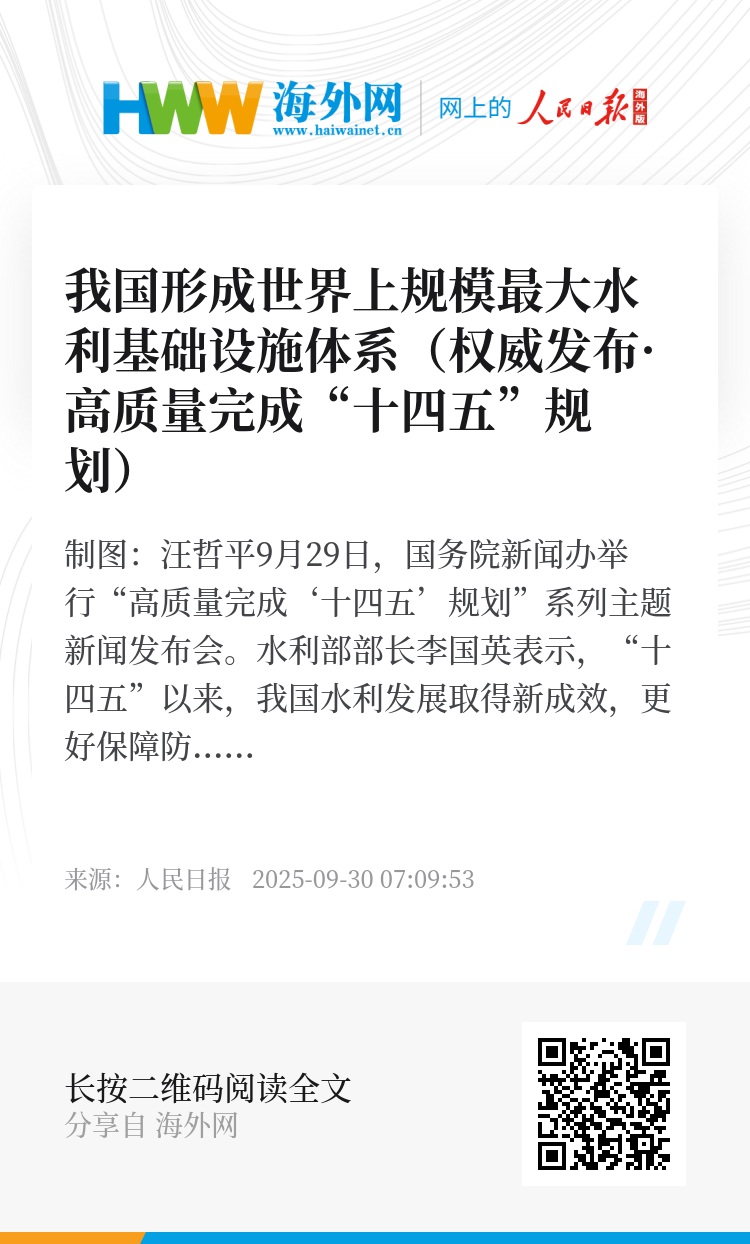 9月29日,国务院新闻办举行“高质量完成‘十四五’规划”系列主题新闻发布会。水利部部长李国英表示,“十四五”以来,我国水利发展取得新成效,更好保障防洪安全、供水安全、粮食安全、生态安全。