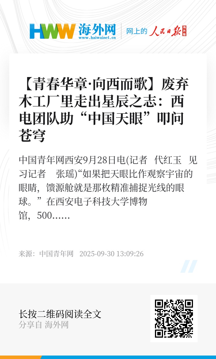 中国青年网西安9月28日电(记者 代红玉 见习记者 张瑶)“如果把天眼比作观察宇宙的眼睛,馈源舱就是那枚精准捕捉光线的眼球。”在西安电子科技大学博物馆,500米口径球面射电望远镜(FAST)的微缩沙盘与背景的璀璨星空相互映射,引发人们的无尽遐想。