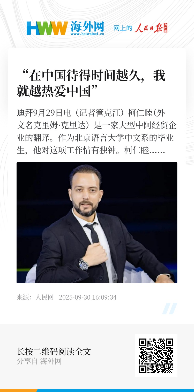 人民网迪拜9月29日电 (记者管克江) 柯仁睦(外文名克里姆·克里达)是一家大型中阿经贸企业的翻译。作为北京语言大学中文系的毕业生,他对这项工作情有独钟。