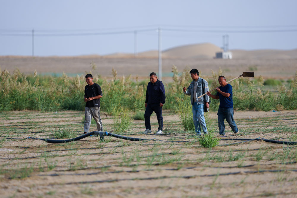 9月19日,在新疆巴音郭楞蒙古自治州尉犁县境内的塔克拉玛干沙漠引洪补水生态渠旁,护林员艾力·尼亚孜(左)和同事开展工作。
