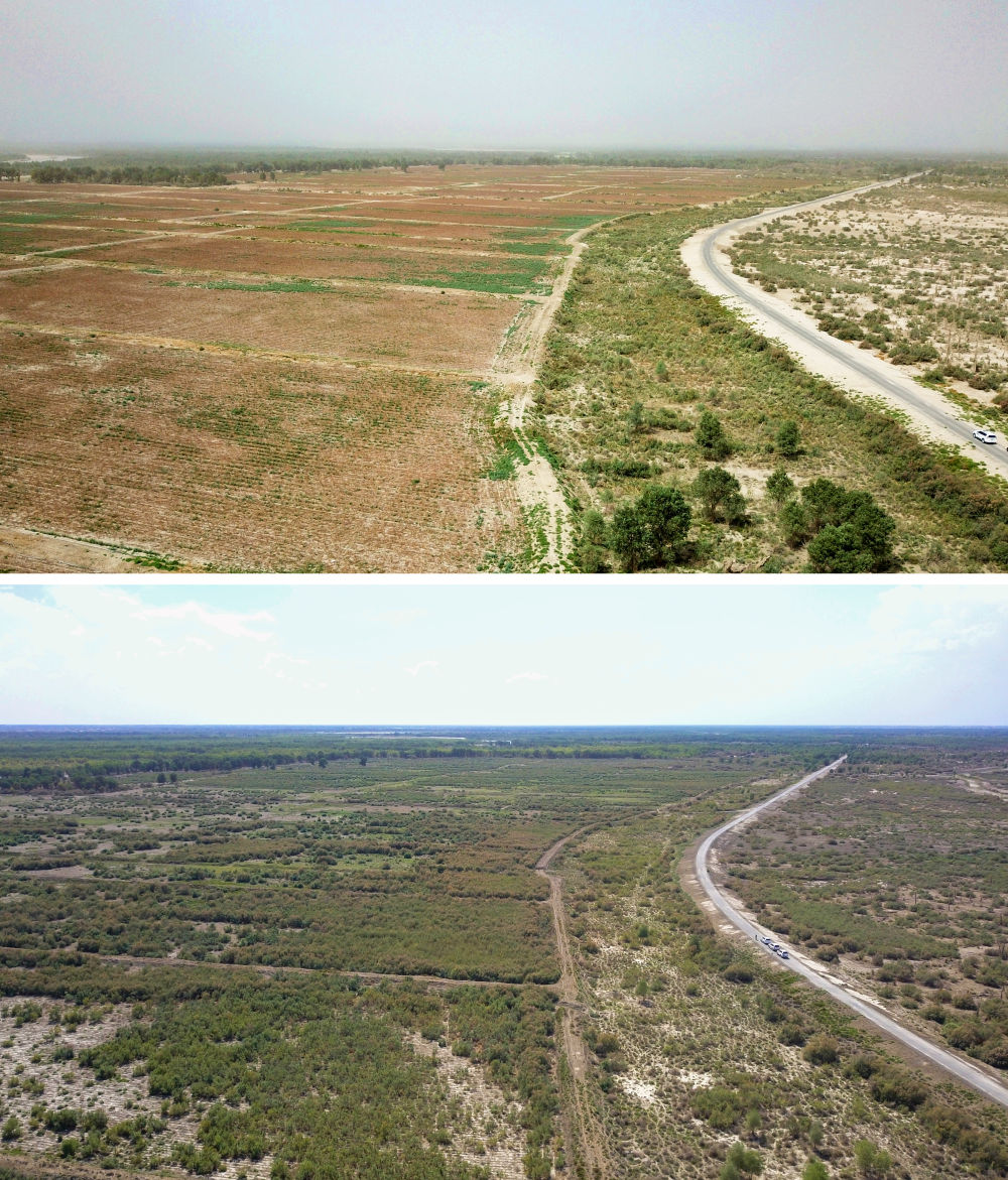 拼版照片:上图为2017年7月24日拍摄的退耕后的塔里木河干流北岸输水堤15公里处的胡杨林保护区(无人机照片);下图为2025年7月拍摄的生态恢复后的同一地点(无人机照片)。该地经生态补水,柽柳、梭梭等天然植被大面积恢复,生长良好。