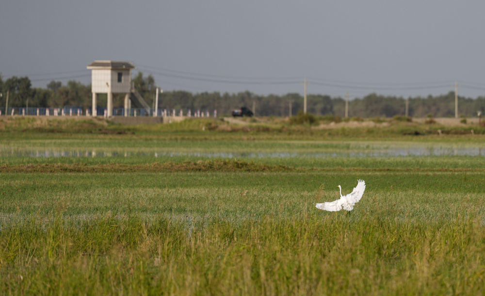 这是9月20日在新疆巴音郭楞蒙古自治州尉犁县一处生态闸附近拍摄的白鹭。