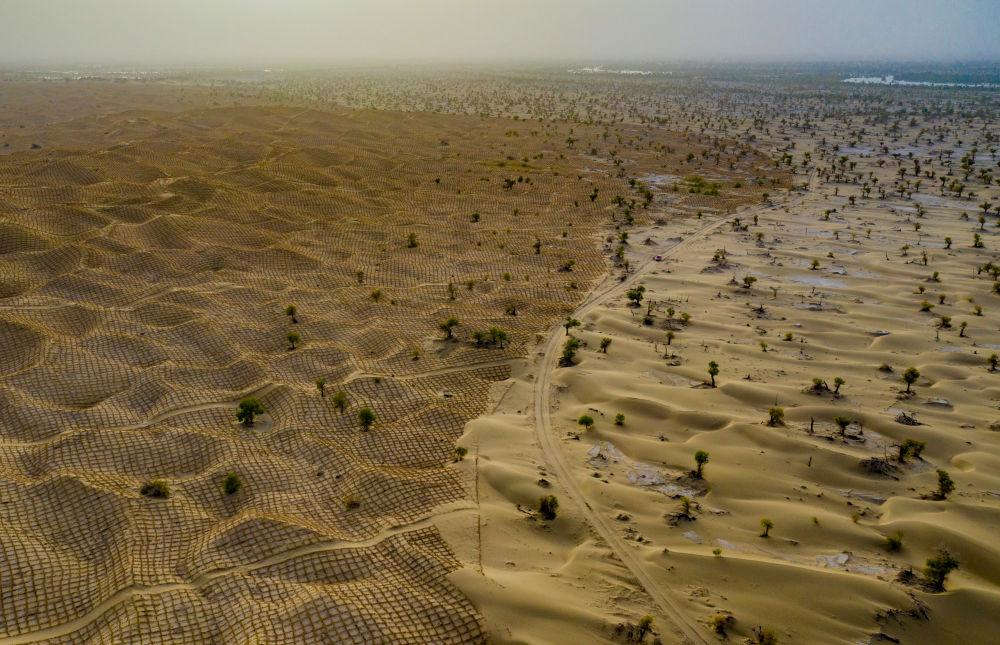 这是9月19日在新疆巴音郭楞蒙古自治州尉犁县拍摄的野生胡杨和草方格。