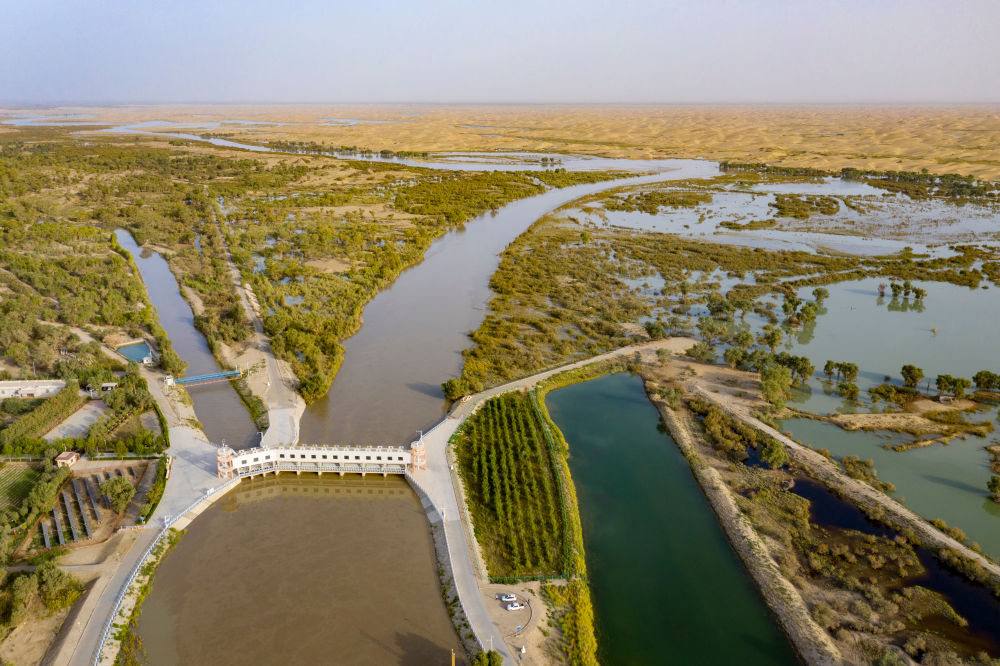 这是9月20日在新疆巴音郭楞蒙古自治州尉犁县拍摄的塔里木河阿其克河口分水枢纽(无人机照片)。这是塔里木河流域综合治理的重要工程之一。