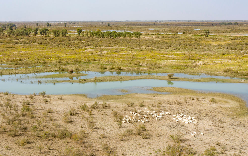 这是9月20日在新疆巴音郭楞蒙古自治州尉犁县喀尔曲尕乡附近的塔里木河流域湿地拍摄的羊群(无人机照片)。