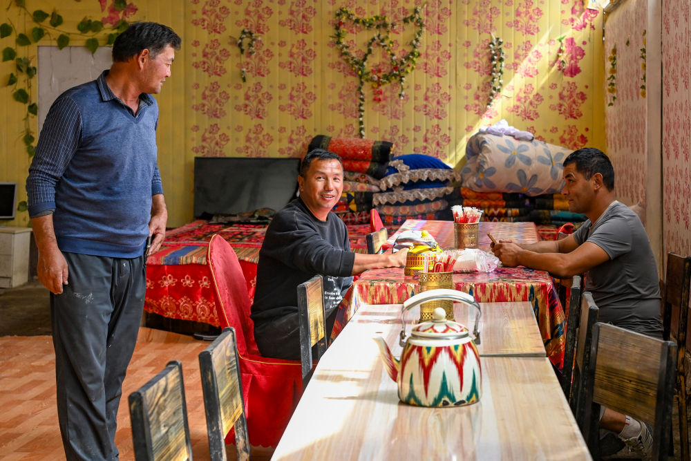 9月20日,新疆巴音郭楞蒙古自治州尉犁县喀尔曲尕乡村民艾尔肯·哈斯木(左)在自家农家乐内招待客人。