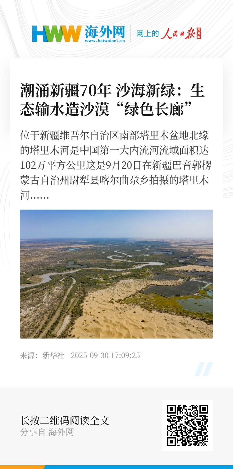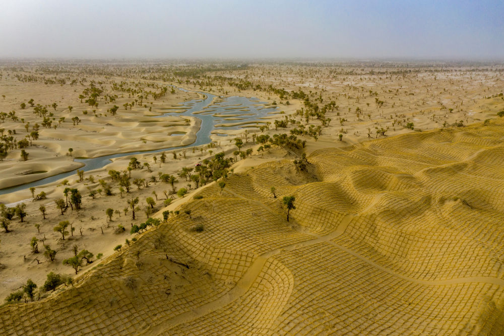 这是9月19日在新疆巴音郭楞蒙古自治州尉犁县拍摄的塔里木河、野生胡杨和草方格(无人机照片)。