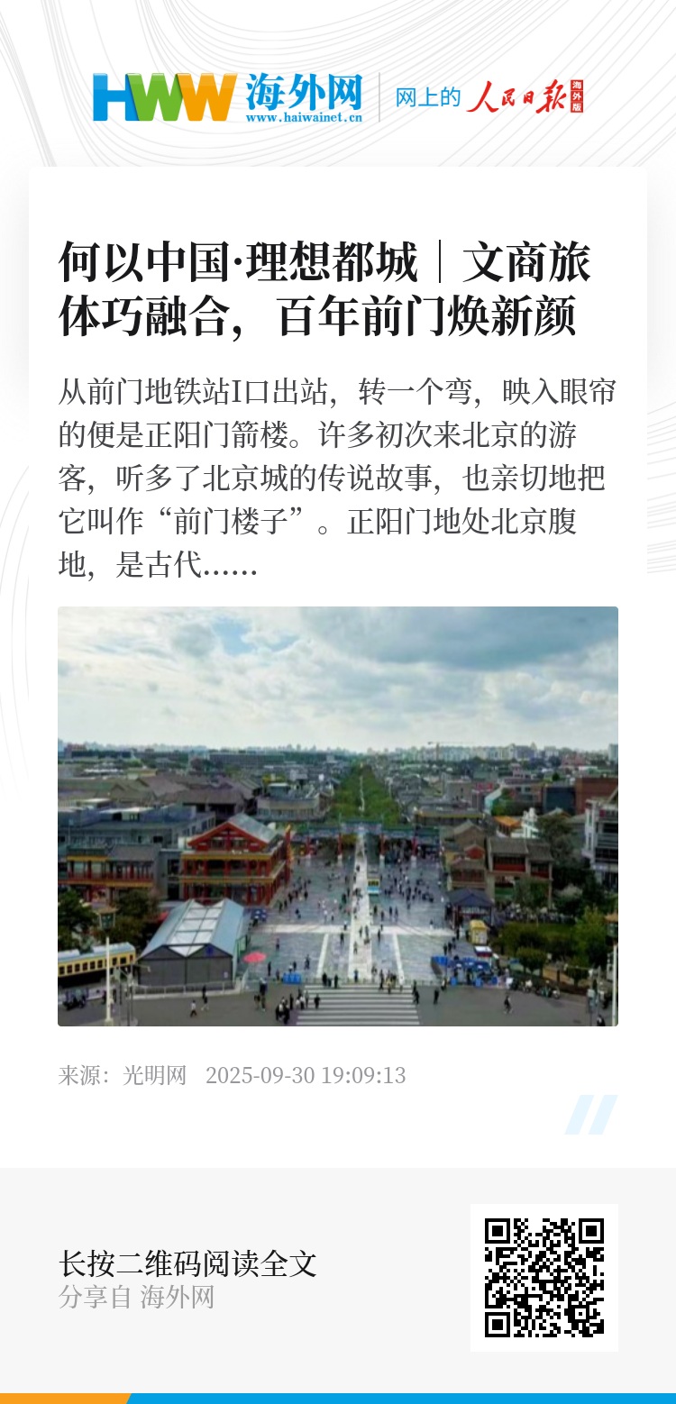 正阳门地处北京腹地,是古代北京皇城的正门,也是目前北京城内唯一一座城门、箭楼均保存完好的城门,具有极高的历史和文化价值。2024年7月,联合国教科文组织正式将“北京中轴线——中国理想都城秩序的杰作”列入《世界遗产名录》,正阳门城楼和箭楼作为重要点位位列其中。9月22日-25日,“何以中国·理想都城”网络主题宣传活动线下媒体行在北京举行。媒体团首站走进北京前门大街,从历史与商业的融合中一睹新时代北京中轴线的全新面貌。