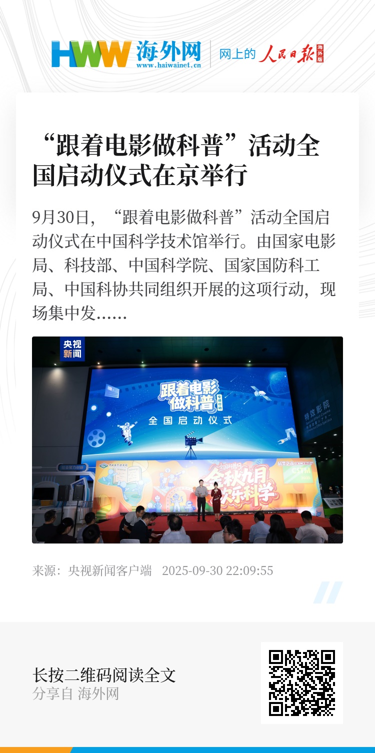 9月30日,“跟着电影做科普”活动全国启动仪式在中国科学技术馆举行。由国家电影局、科技部、中国科学院、国家国防科工局、中国科协共同组织开展的这项行动,现场集中发布了首批“跟着电影做科普”的产品和活动,促进电影和科普深度融合、相互赋能,助力新时代电影和科普高质量发展。