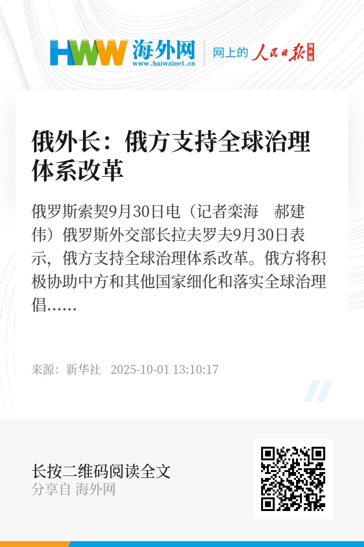 新华社俄罗斯索契9月30日电(记者栾海 郝建伟)俄罗斯外交部长拉夫罗夫9月30日表示,俄方支持全球治理体系改革。俄方将积极协助中方和其他国家细化和落实全球治理倡议。
