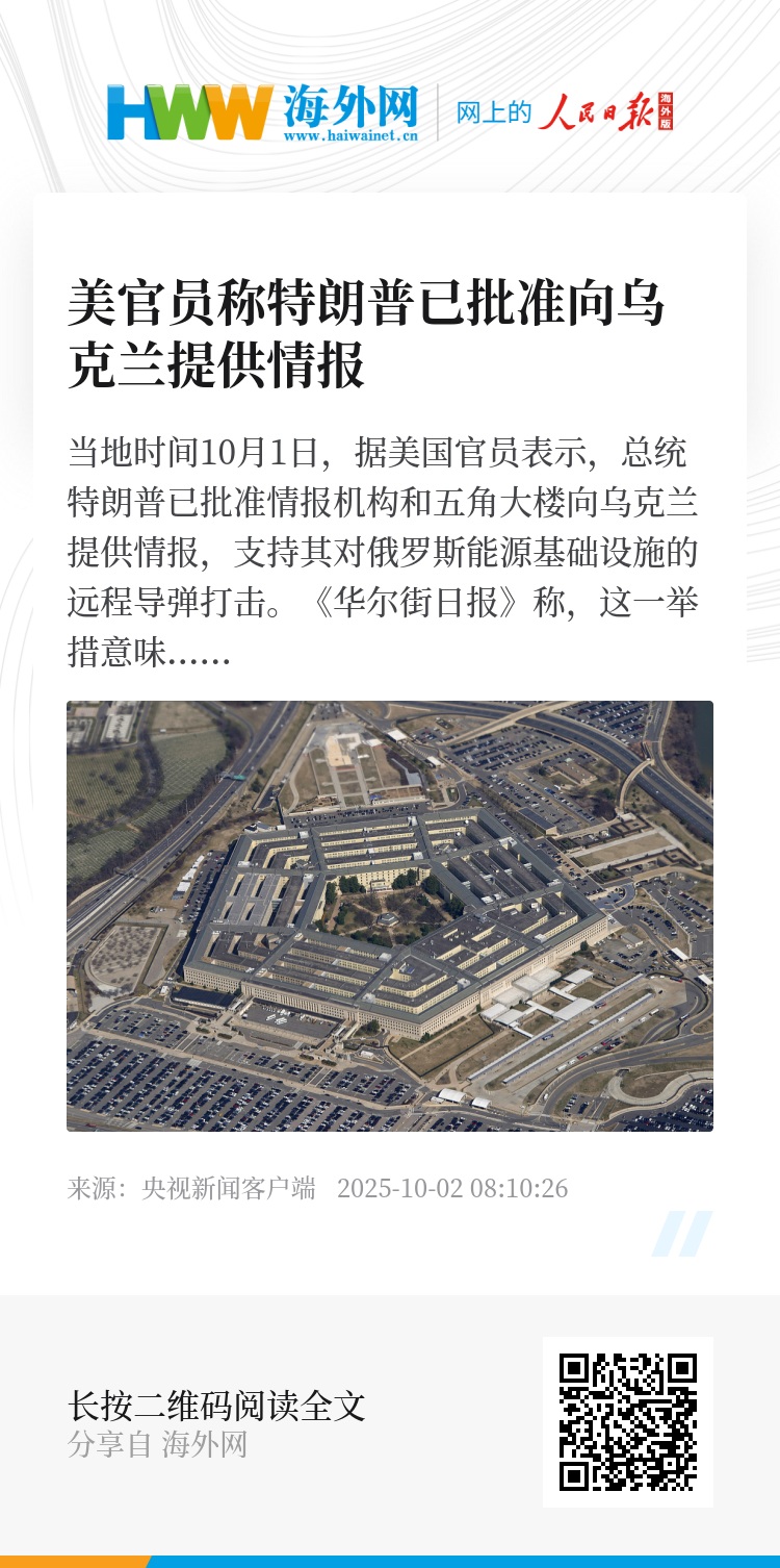 当地时间10月1日,据美国官员表示,总统特朗普已批准情报机构和五角大楼向乌克兰提供情报,支持其对俄罗斯能源基础设施的远程导弹打击。