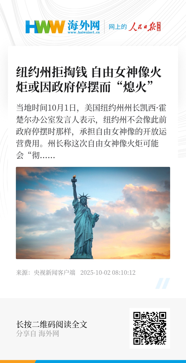 当地时间10月1日,美国纽约州州长凯西·霍楚尔办公室发言人表示,纽约州不会像此前政府停摆时那样,承担自由女神像的开放运营费用。州长称这次自由女神像火炬可能会“彻底熄灭”。