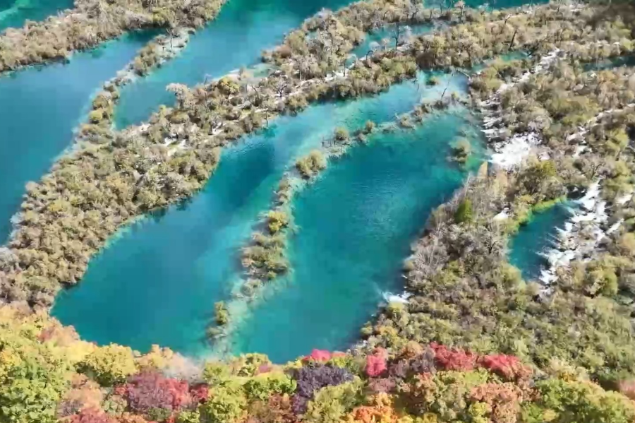 在位于青藏高原东部边缘的九寨沟,秋意犹如一支画笔在山水间点染,镶嵌在大山怀抱里的湖泊,把最后一丝翠绿悄悄换成孔雀蓝,澄澈的湖面像一块被阳光熨平的丝绸。抬眼望去,山坡上冷杉与枫桦交错,浅黄、绯红、墨绿层层晕开。