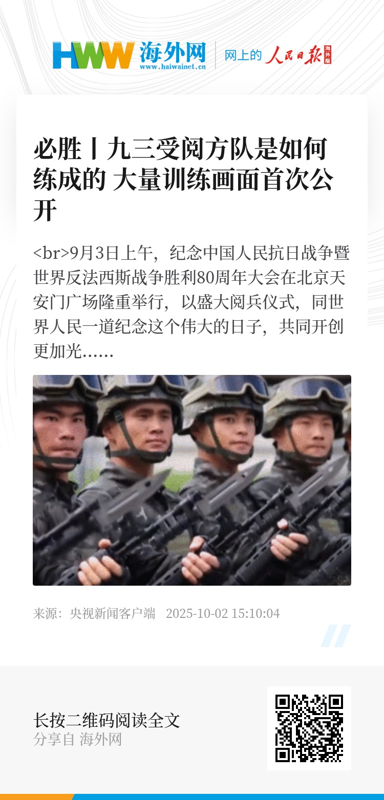 2025年9月3日,纪念中国人民抗日战争暨世界反法西斯战争胜利80周年大会在北京天安门广场隆重举行,受阅方队的每一步踏出了人民军队震彻山河的钢铁威仪。新时代强军征程上,人民军队的每一步穿过历史的硝烟,承载着和平的期待。复兴之路上,中华民族的每一步从苦难中奋起,在磨砺中自强,终将走向壮阔的远方。