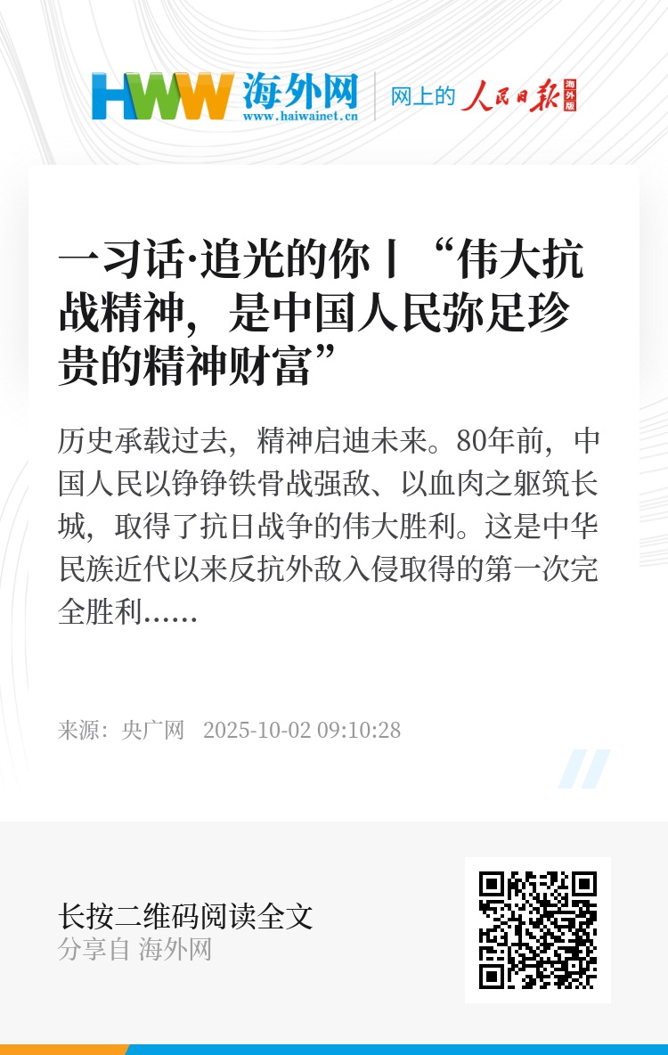 80年前,中国人民以铮铮铁骨战强敌、以血肉之躯筑长城,取得了抗日战争的伟大胜利。这是中华民族近代以来反抗外敌入侵取得的第一次完全胜利。这场伟大胜利也铸就了伟大抗战精神。党的十八大以来,习近平总书记多次强调要弘扬伟大抗战精神,指出伟大抗战精神是中国人民弥足珍贵的精神财富。9月30日是第十二个烈士纪念日,让我们始终传承和弘扬伟大抗战精神,踔厉奋发、勇毅前行,为以中国式现代化全面推进强国建设、民族复兴伟业而团结奋斗!