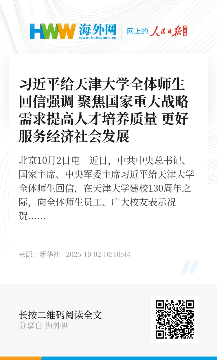 新华社北京10月2日电 近日,中共中央总书记、国家主席、中央军委主席习近平给天津大学全体师生回信,在天津大学建校130周年之际,向全体师生员工、广大校友表示祝贺。