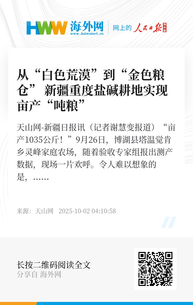 天山网-新疆日报讯(记者谢慧变报道)“亩产1035公斤!”9月26日,博湖县塔温觉肯乡灵峰家庭农场,随着验收专家组报出测产数据,现场一片欢呼。令人难以想象的是,这片丰收的玉米田,曾经是土壤含盐量达19克/公斤的重度盐碱耕地。