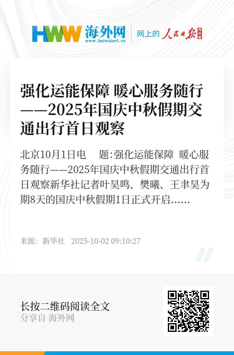 新华社北京10月1日电 题:强化运能保障 暖心服务随行——2025年国庆中秋假期交通出行首日观察