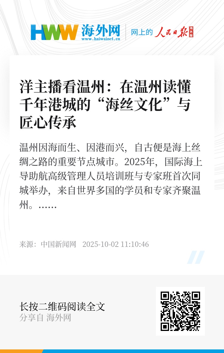 温州因海而生、因港而兴,自古便是海上丝绸之路的重要节点城市。2025年,国际海上导助航高级管理人员培训班与专家班首次同城举办,来自世界多国的学员和专家齐聚温州。在这片延续“海丝”记忆的土地上,他们以航标为题,展开一场跨越国界的航海文明对话。来自马来西亚的中新网特约洋主播陈俪心跟随培训班学员,在江心屿感受历史与海浪的对话,在劳模工匠馆触摸油纸伞技艺的匠心传承,在中国眼谷体验黑科技。她感叹,温州是一座让传统与现代、东方与世界在此交汇的城市。在这里,“海丝文化”与“匠心精神”相互辉映,世界也因航海再度紧密相连。(周健 胡海英)