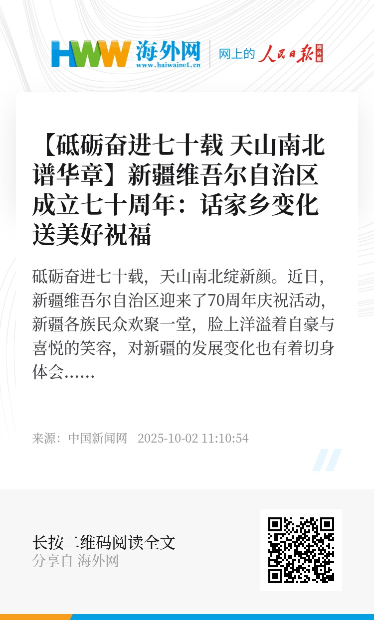 砥砺奋进七十载,天山南北绽新颜。近日,新疆维吾尔自治区迎来了70周年庆祝活动,新疆各族民众欢聚一堂,脸上洋溢着自豪与喜悦的笑容,对新疆的发展变化也有着切身体会,心中满满都是对这片土地深深的热爱和对未来的美好憧憬与祝福。(记者 赵雅敏 苟继鹏 张杨彬 新疆综合报道)
