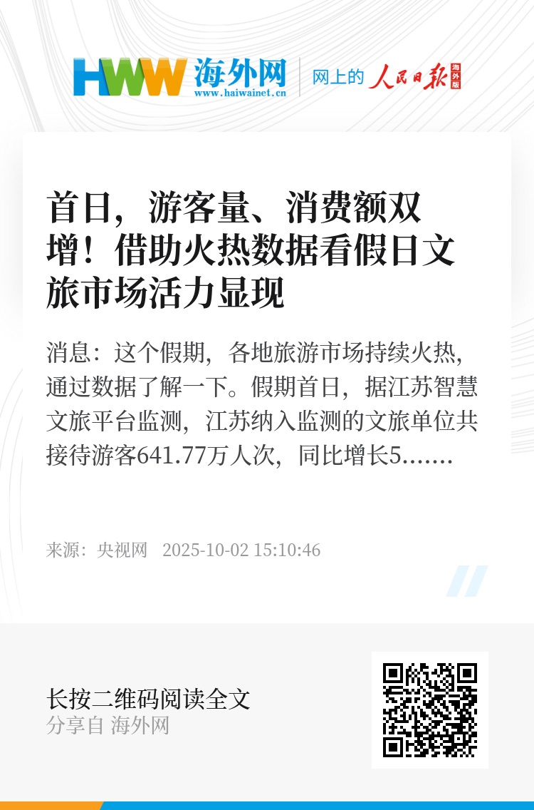 央视网消息:这个假期,各地旅游市场持续火热,通过数据了解一下。假期首日,据江苏智慧文旅平台监测,江苏纳入监测的文旅单位共接待游客641.77万人次,同比增长5.29%;游客消费总额达24.82亿元,同比增长4.95%。江苏省内备案博物馆(纪念馆)共接待观众超过57万人次,文创收入超过217万元。