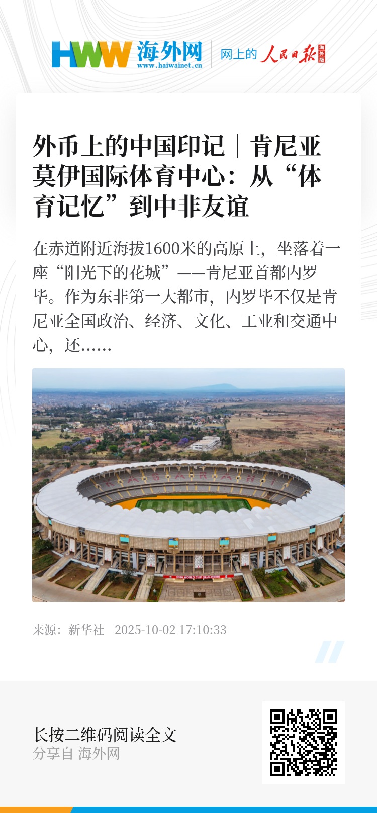 莫伊国际体育中心不仅承载着肯尼亚人民的体育记忆,更象征着中肯两国之间历久弥坚的友谊。将其印在国家货币上,体现了肯尼亚对这段合作关系的珍视。从图纸到现实,从地标到货币,这背后是中非携手、共同发展的生动故事。(记者:曾涛、许嘉桐、韩旭、代贺、郑梦雨;报道员:詹姆斯;视频:黄瀚宇、操兰漪)