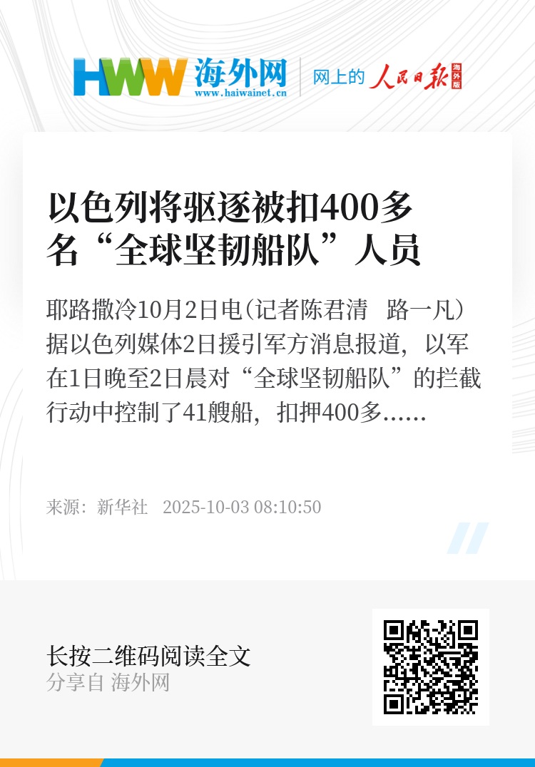 新华社耶路撒冷10月2日电(记者陈君清 路一凡)据以色列媒体2日援引军方消息报道,以军在1日晚至2日晨对“全球坚韧船队”的拦截行动中控制了41艘船,扣押400多人。这些人将被驱逐出境。