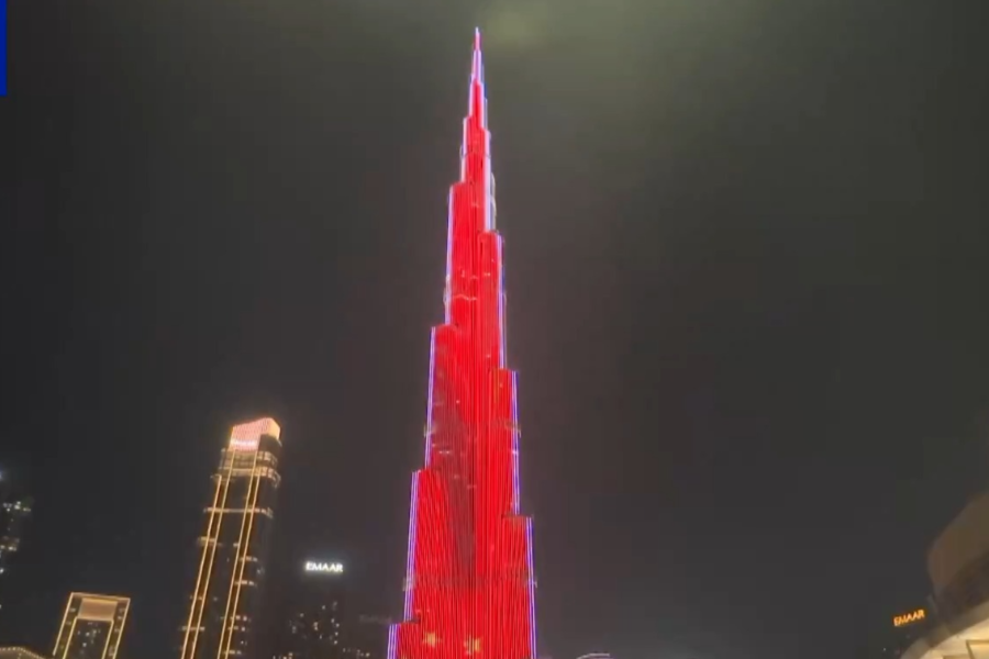 当地时间10月1日晚,位于阿联酋迪拜的世界第一高楼哈利法塔再度点亮“中国红”,绚丽光影将五星红旗图案展现在828米高的塔身上。中国驻迪拜总领馆工作人员和当地华侨华人也纷纷自发前往,共同见证这一激动人心的时刻,用不同方式庆祝中华人民共和国成立76周年。