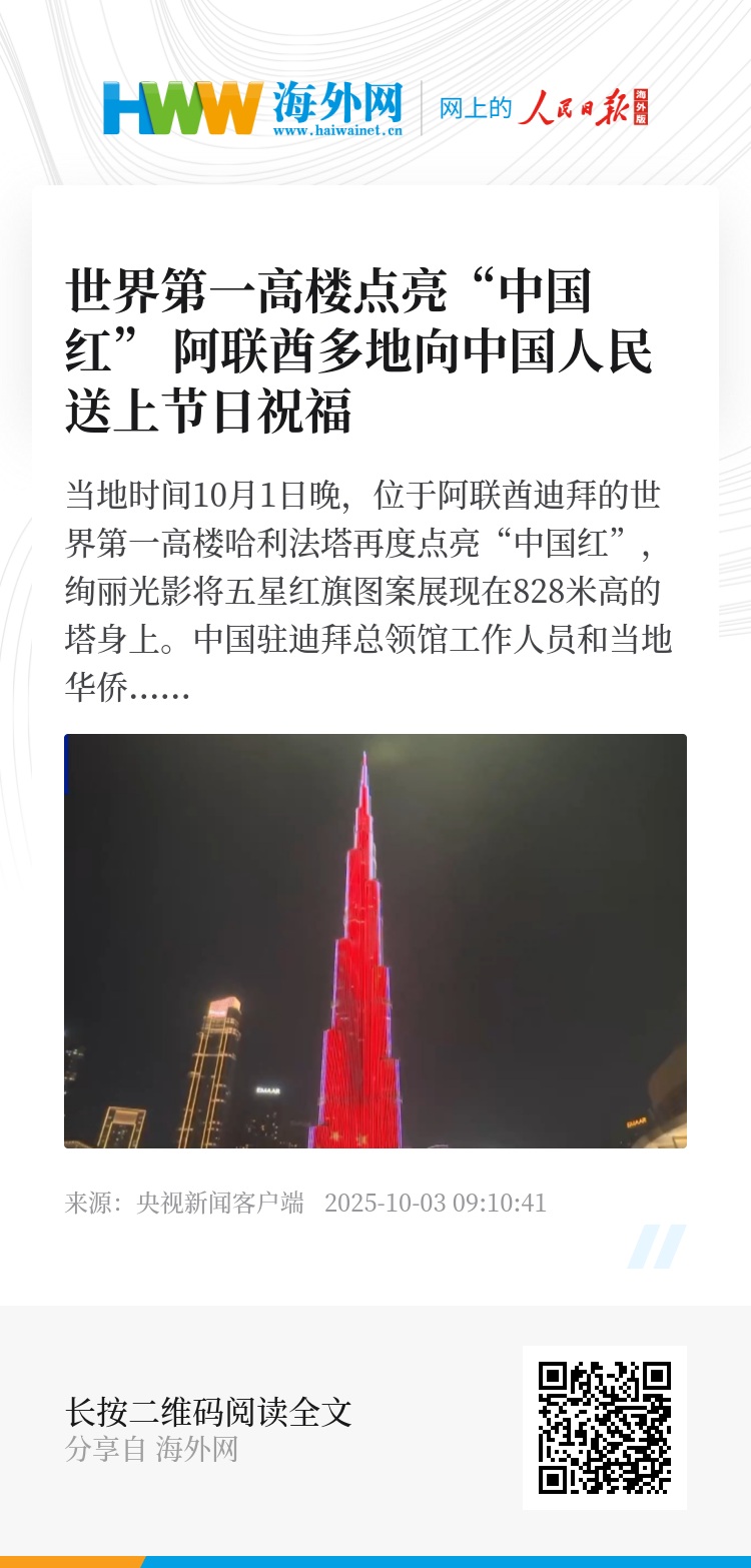 同一天,阿布扎比国家石油公司总部等多个地标性建筑也亮起五星红旗,多地醒目位置标牌循环播放国庆贺词,以各种形式向中国人民致以节日祝福。(总台记者 李超 姚书博)