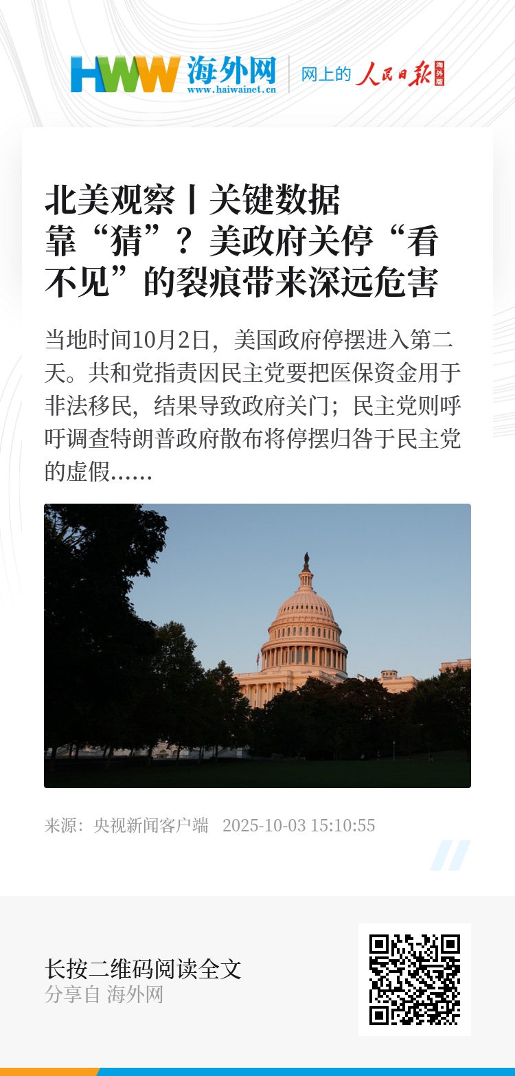 美国政府关门,表面看是几天的不便和行政调整,实则在经济、治理、信誉和国家竞争力层面留下了多道隐形裂痕。就业报告可能无声、监管功能瘫痪、信用曲线下滑、科研项目滞后、人才信心崩塌、合同链条断裂、国际信任受损——每一条都是对治理能力与制度建设的大考。公众看到的只是关门的表象,而真正代价,己如“看不见”的裂痕在蔓延。(央视记者 武卫红)