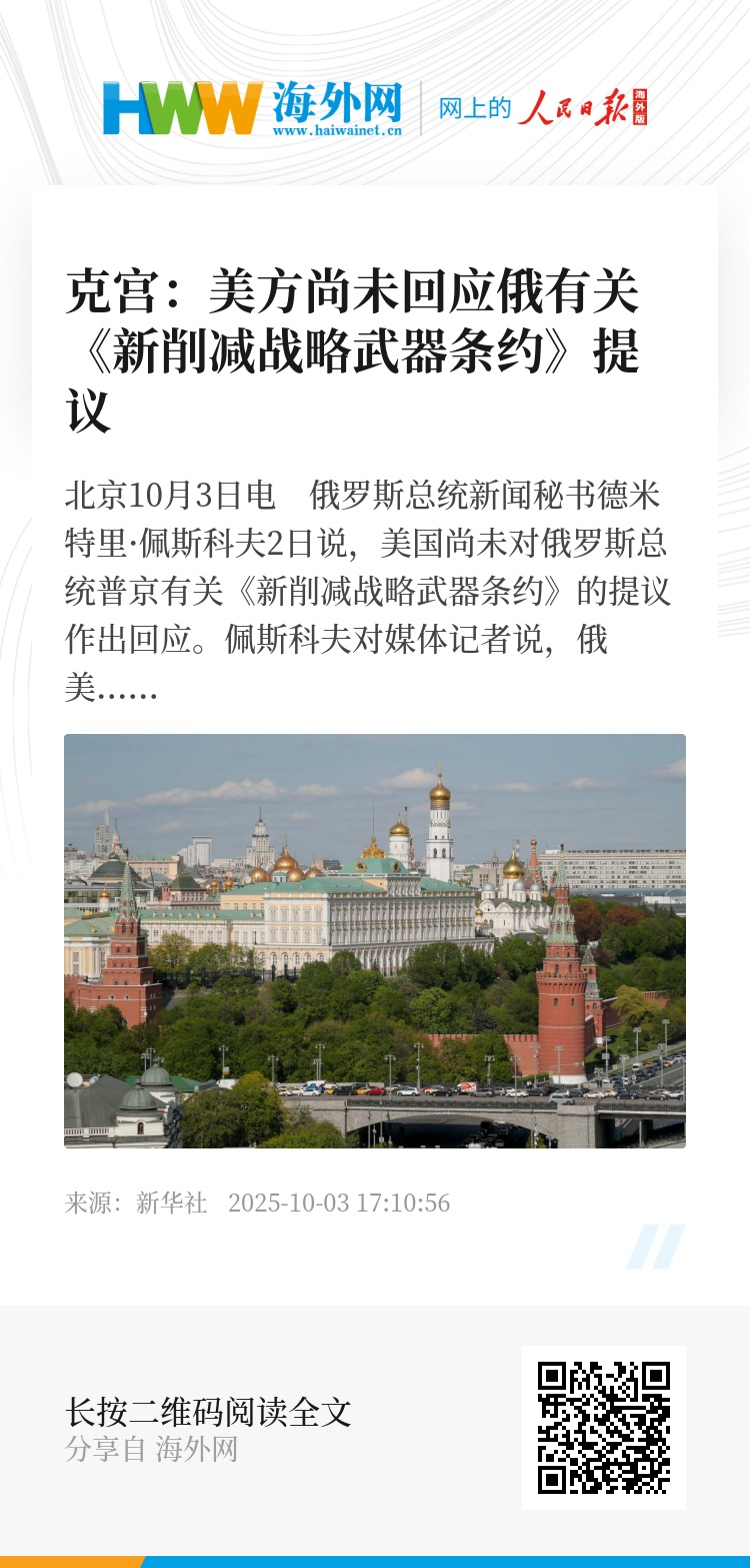 新华社北京10月3日电 俄罗斯总统新闻秘书德米特里·佩斯科夫2日说,美国尚未对俄罗斯总统普京有关《新削减战略武器条约》的提议作出回应。