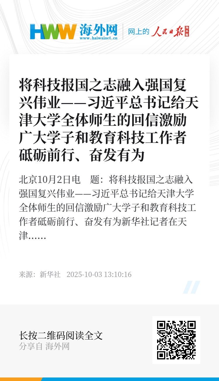新华社北京10月2日电 题:将科技报国之志融入强国复兴伟业——习近平总书记给天津大学全体师生的回信激励广大学子和教育科技工作者砥砺前行、奋发有为
